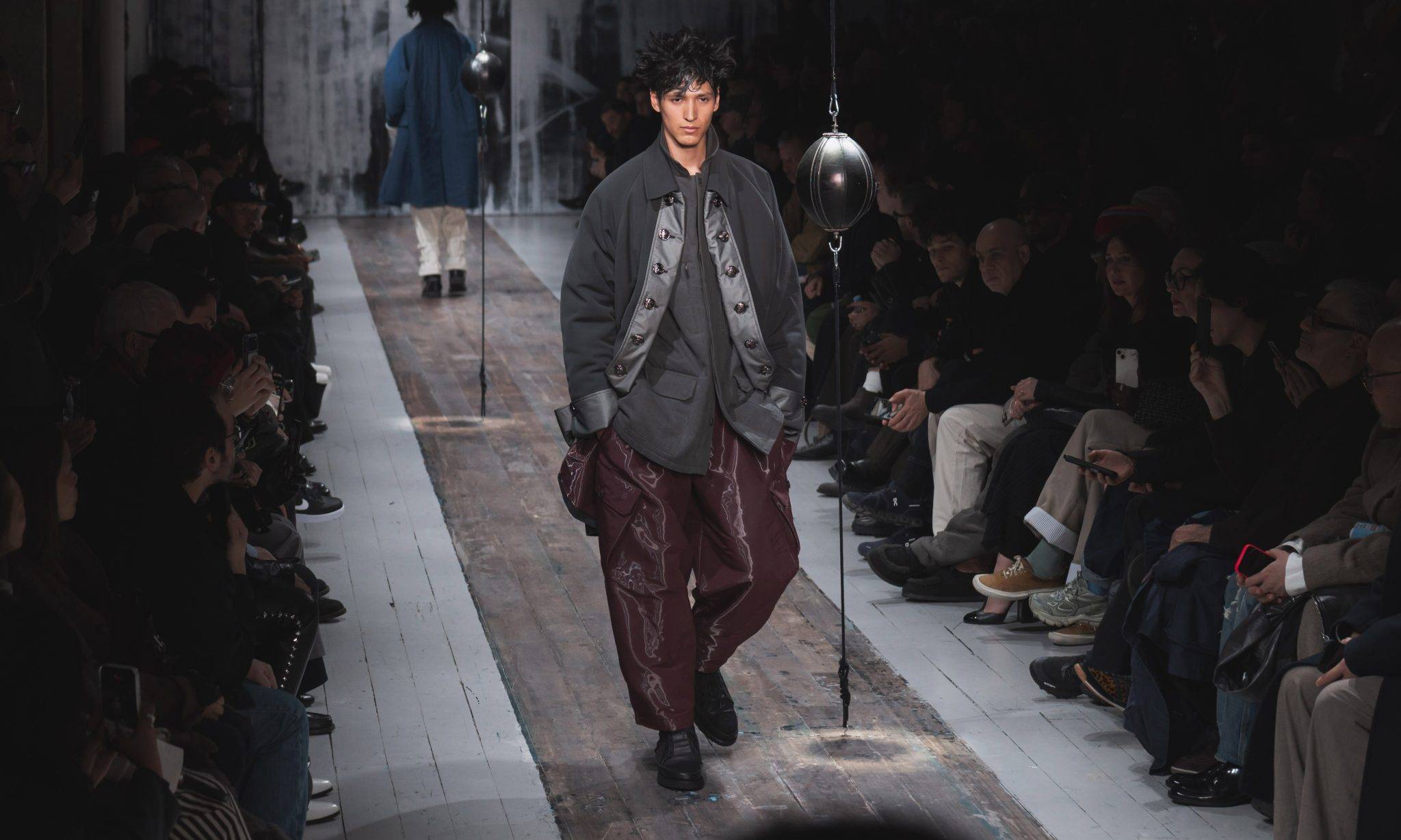 Deconstructed and crafted in every conceivable shade of black, Yohji Yamamoto’s designs embody, above all, an unflinching critique of contemporary society. Expressed through elegant garments executed with impeccable artistry, his urge to subvert convention feels more palpable than ever this season. Boxing pads were placed at the centre of the catwalk, inviting models to step into the ring. Were they a symbol of the battles still to be fought within the industry, or a broader metaphor for the political turmoil sweeping the world? Either way, this was hardly the Japanese designer’s first rodeo. The silhouettes followed one another with the solemnity that defines a Yohji Yamamoto show. Moving slowly, the models strode down the runway with stoic resolve, almost flirting with these combat-like objects. As if to counterbalance the symbolic brutality of the ring, the collection felt almost colourful by Yohji Yamamoto’s standards. Cream, off-white and nude ensembles lit up the catwalk, while military motifs brought together greens, browns and blues, not forgetting a few touches of red set against the signature black palette.